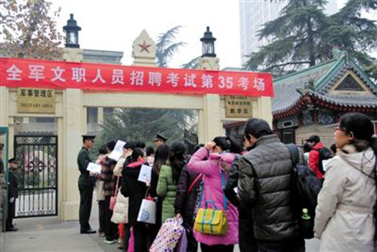 12月15日,在解放軍南京政治學院考點,考生等候進場參加考試。當日,軍隊首次統(tǒng)一招聘文職人員考試舉行,據(jù)解放軍總政治部有關(guān)部門介紹,共有10萬余人報名應(yīng)聘,報名和錄取比例平均為38∶1。
