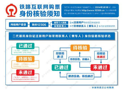 據(jù)介紹,實(shí)施身份信息核驗(yàn)后,在12306網(wǎng)站上使用二代居民身份證的注冊用戶和常用聯(lián)系人身份信息將有“已通過”、“待核驗(yàn)”、“未通過”三種核驗(yàn)狀態(tài),使用護(hù)照、港澳居民來往內(nèi)地通行證、臺灣居民來往大陸通行證的注冊用戶和常用聯(lián)系人身份信息將有“已通過”、“請報(bào)驗(yàn)”、“預(yù)通過”、“未通過”四種核驗(yàn)狀態(tài)。